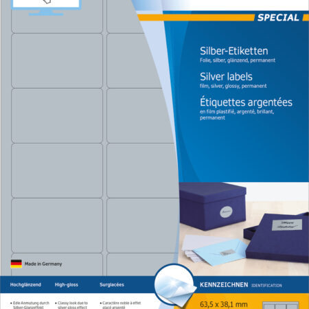 Silver Foil Labels A4, 63.5 x 29.6mm, Glossy, Weatherproof, Permanent Adhesion