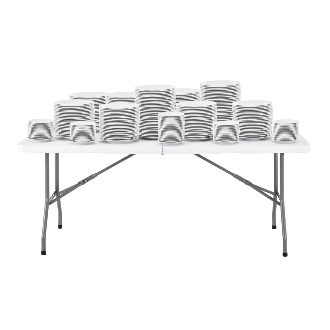 Quickly boost your catering capacity with Bolero’s sturdy 6ft centre folding table. Built to support up to 200kg of evenly distributed weight without bending or breaking, it’s a reliable choice for buffets, parties, banquets and weddings. The spacious surface seats multiple guests comfortably, helping you cut down on the number of tables needed per service.Featuring a high-density polyethylene (HDPE) top and steel legs, this rectangular table is designed for long-lasting durability. Its foldable, lightweight design and integrated carry handle make it easy for staff to set up, pack down, transport and store. It also includes foot plugs that help prevent movement during use and protect floors from accidental scrapes and scratches.